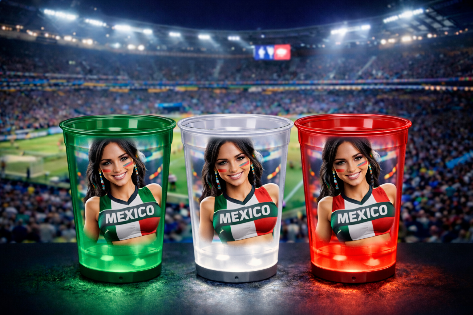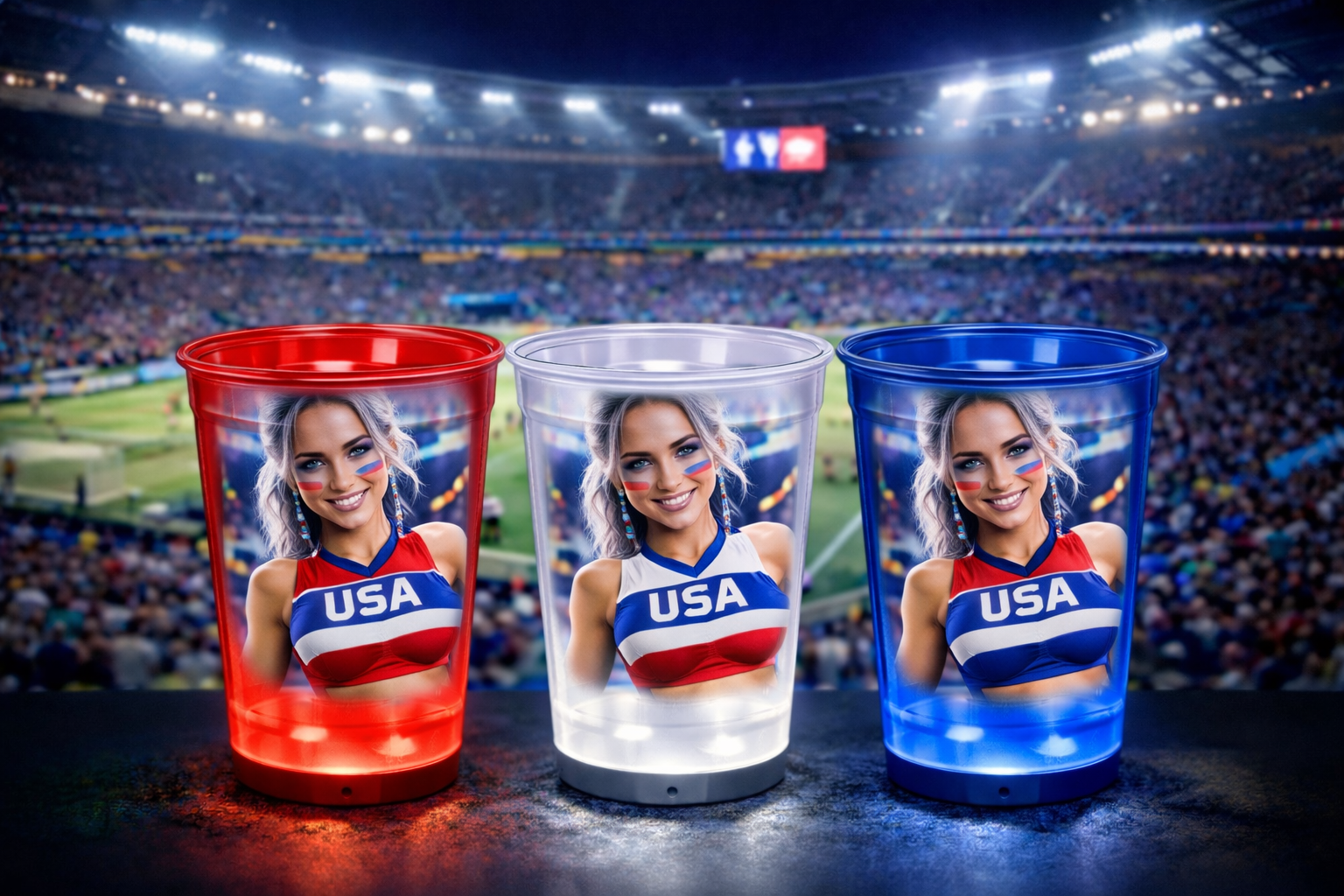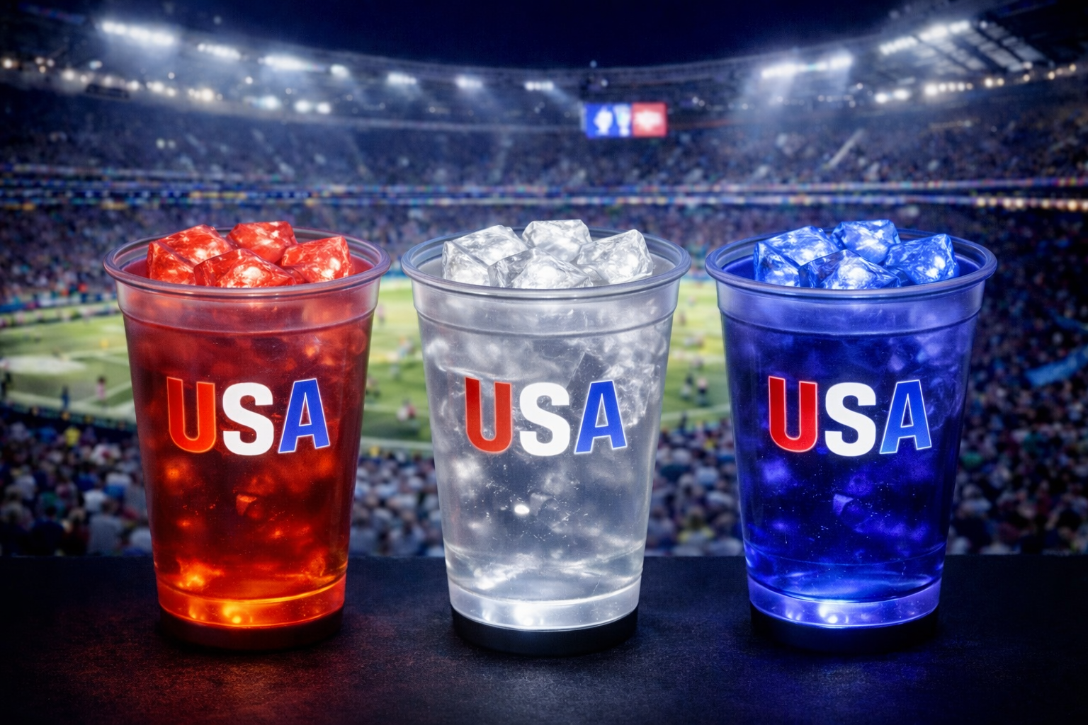 For the first time ever, LED cups and Ice Cubes that scroll through team colors – from USA to any club, any game.